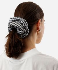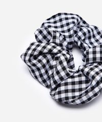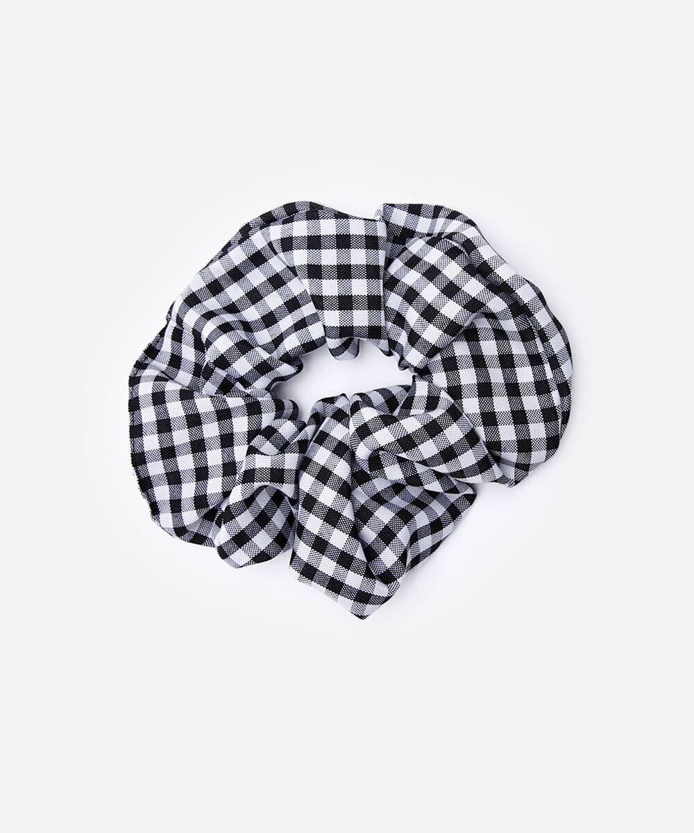 Scrunchie de cabelo confeccionado em tecido plano com estampa xadrez e elástico embutido.