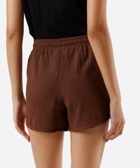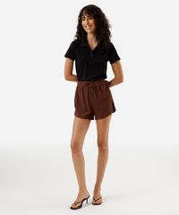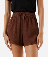 Short feminino confeccionado em tecido plano texturizado. A peça tem modelagem reta e caimento solto ao corpo. O modelo tem cintura alta, cós com elástico embutido e cordão. Possui acabamento em viés nas barras.