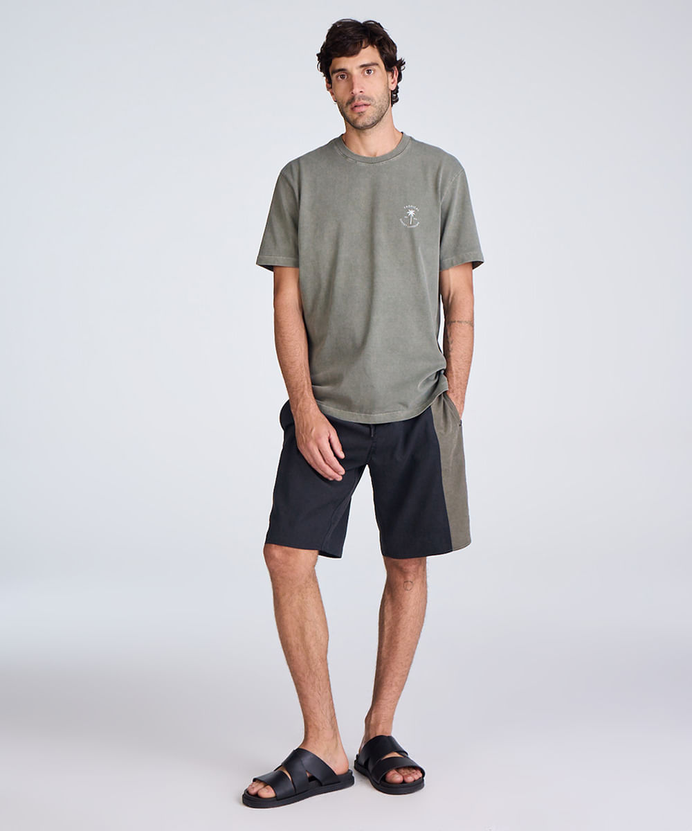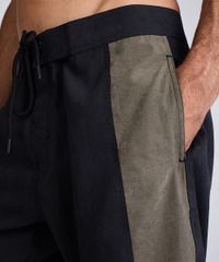Short masculino confeccionado em tecido com poliamida e toque leve. A peça possui modelagem boardshort com caimento reto, cintura média, cós com costura e cordão para ajuste, dois bolsos frontais estilo faca e um bolso posterior com lapela, fechamento frontal por velcro, detalhe nas laterais de recorte em cor contrastante e acabamento pespontado.