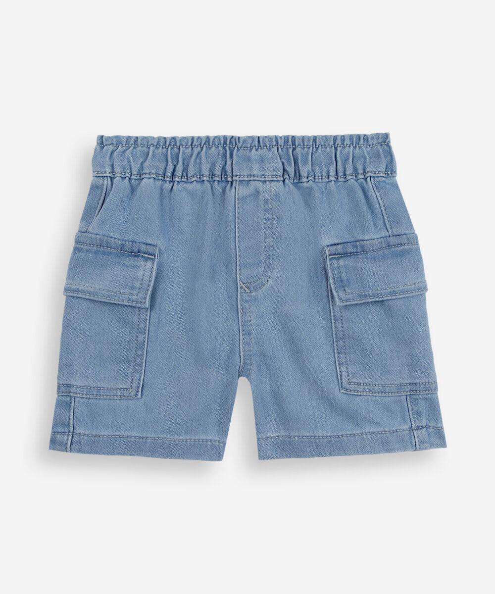 Short infantil confeccionado em jeans maleável com toque macio. A peça possui modelagem reta com caimento levemente solto, cintura média, cós com elástico embutido, dois bolsos nas laterais estilo cargo com lapela, detalhe de recortes e acabamento pespontado.