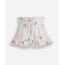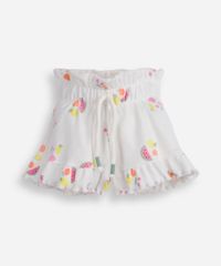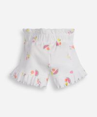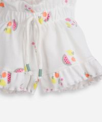 Short infantil confeccionado em algodão com toque canelado. Possui modelagem com efeito evasê, comprimento curto, cintura alta clochard, cós com elástico embutido, cordão aplicado com ponteiras em cor contrastante, barra com babados, estampa de frutas sortidas e acabamento pespontado.