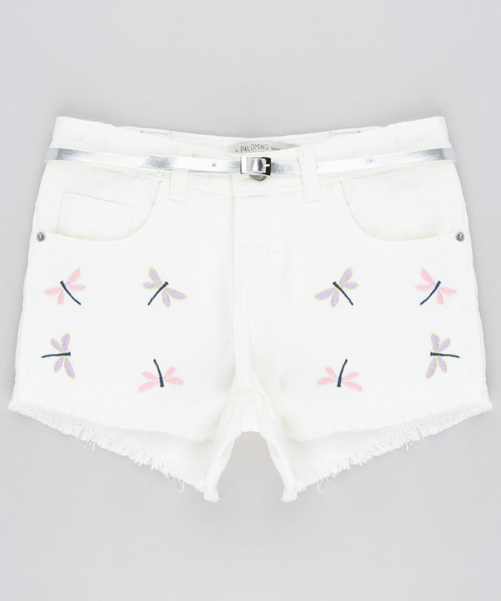 Short infantil feminino desenvolvido em sarja. Tem detalhe de bordado de libélula. A peça possui dois bolsos frontais e dois posteriores. O cós tem passantes e possui elástico com botão embutidos para melhor ajuste na parte interna. O fechamento é frontal por botão. A barra tem acabamento desfiado. Acompanha um cinto fino com aspecto metalizado.
