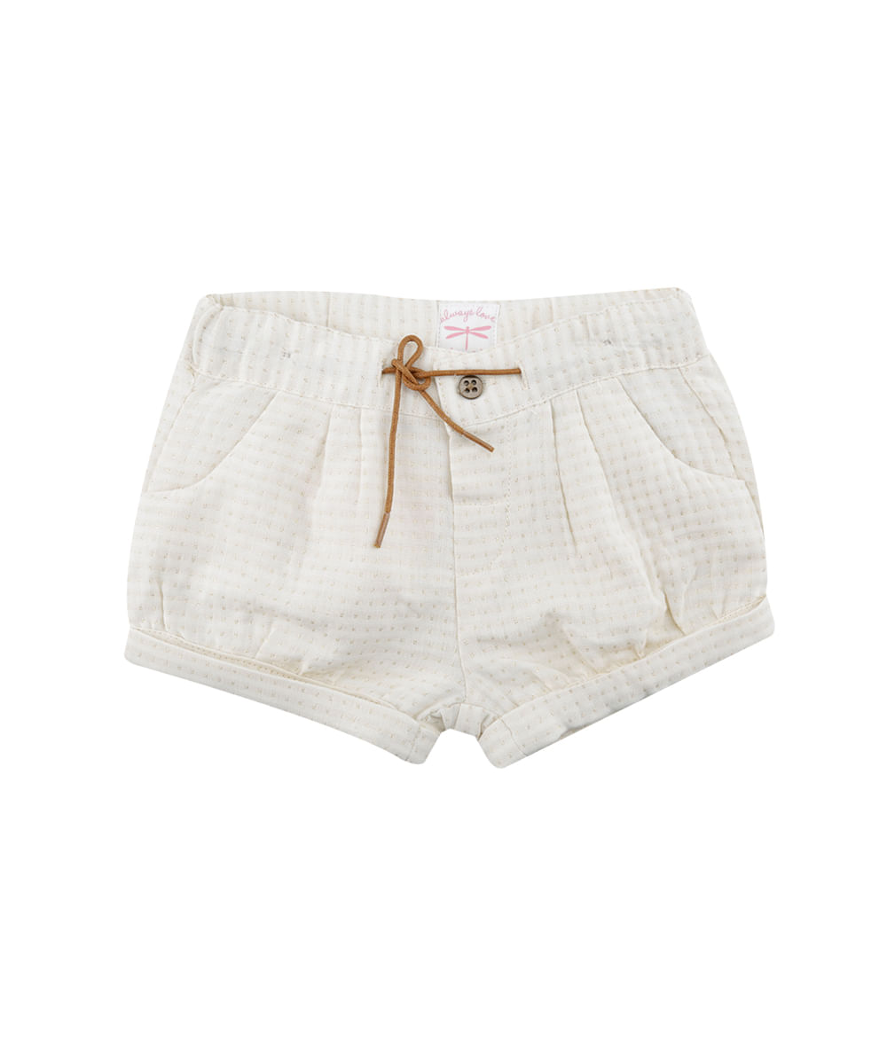 Short desenvolvido em tecido plano com fios metalizados, deixando a peça com mais brilho. O modelo balonê tem volume formado pelas pregas no cós e pela barra dobrada. A parte frontal tem dois bolsos enquanto a posterior tem dois embutidos. O cós tem elástico e cordão de ajuste embutidos.