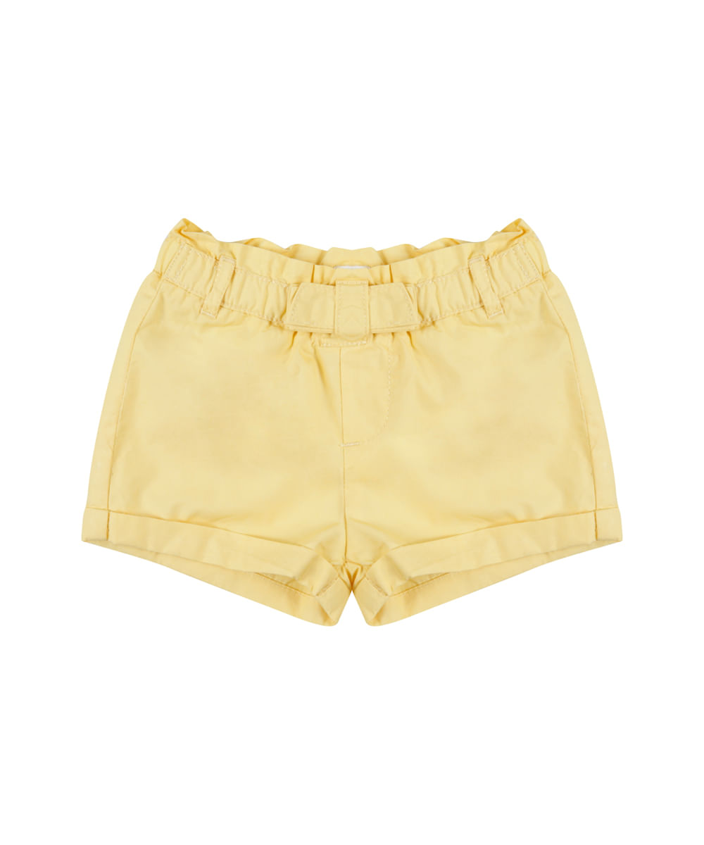 Short desenvolvido em tecido plano com toque macio. O cós ajustável tem elástico e recorte com cinto embutido. Na parte frontal tem o detalhe de laço aplicado. Tem dois bolsos posteriores e a barra é dobrada.