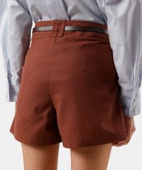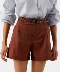 Short de alfaiataria feminino confeccionado em tecido plano com linho. A peça tem modelagem reta e caimento solto ao corpo. O modelo tem cintura alta, cós com passantes para cinto, pregas decorativas e fechamento por zíper e botão. Possui dois bolsos frontais e dois aplicados na parte posterior. Detalhe de acabamento pespontado nas barras. Acompanha cinto em material sintético.
