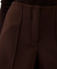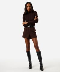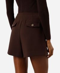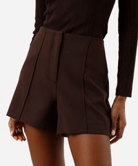 Short de alfaiataria feminino confeccionada em tecido plano com viscose. A peça tem modelagem reta, caimento solto ao corpo e nervuras frontais. O modelo tem cintura alta, cós liso e fechamento por zíper e botão. Possui dois bolsos frontais, dois decorativos na parte posterior e acabamento em pesponto invisível nas barras.