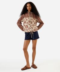 Short feminino confeccionadao em tecido plano com viscose. A peça tem modelagem reta e caimento solto ao corpo. O modelo tem cintura alta, cós liso com elástico embutido e fechamento por zíper e botão. Possui dois bolsos frontais e acabamento com fendas arredondadas laterais.