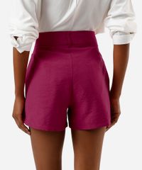 Short de alfaiataria feminino confeccionado em tecido plano com textura em viscose. A peça tem modelagem reta e caimento solto ao corpo. O modelo tem cintura alta, cós com passantes para cinto, pregas frontais e fechamento por zíper e botão. Possui dois bolsos embutidos frontais e acabamento pespontado nas barras.
