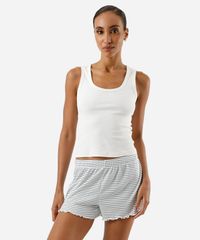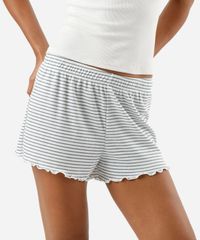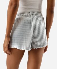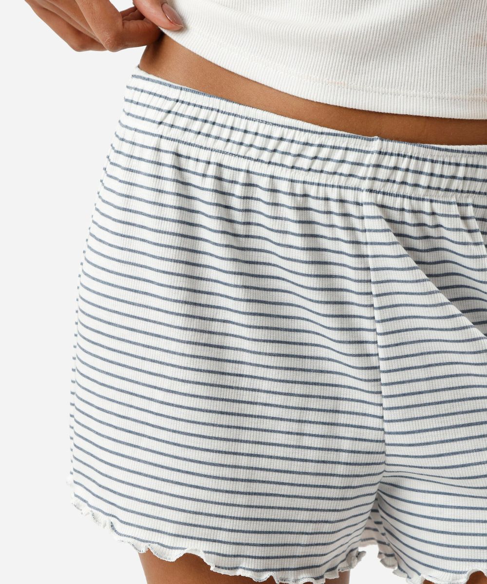 Short de pijama feminino confeccionado em malha canelada com viscose e estampa listrada. A peça tem modelagem reta com caimento solto ao corpo. Possui cintura média, cós com elástico embutido e frufru nas barras.