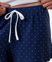 Short de pijama feminino confeccionada em malha com estampa poá. A peça tem modelagem reta e caimento solto ao corpo. O modelo tem cintura média, cós com elástico embutido e cordão. Possui acabamento pespontado nas barras.