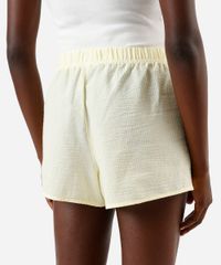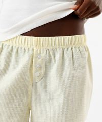 Short de pijama confeccionado em tecido leve texturizado com padronagem listrada. A peça possui cintura alta, cós elástico, detalhe frontal de botões decorativos, caimento reto e solto ao corpo e acabamento pespontado.