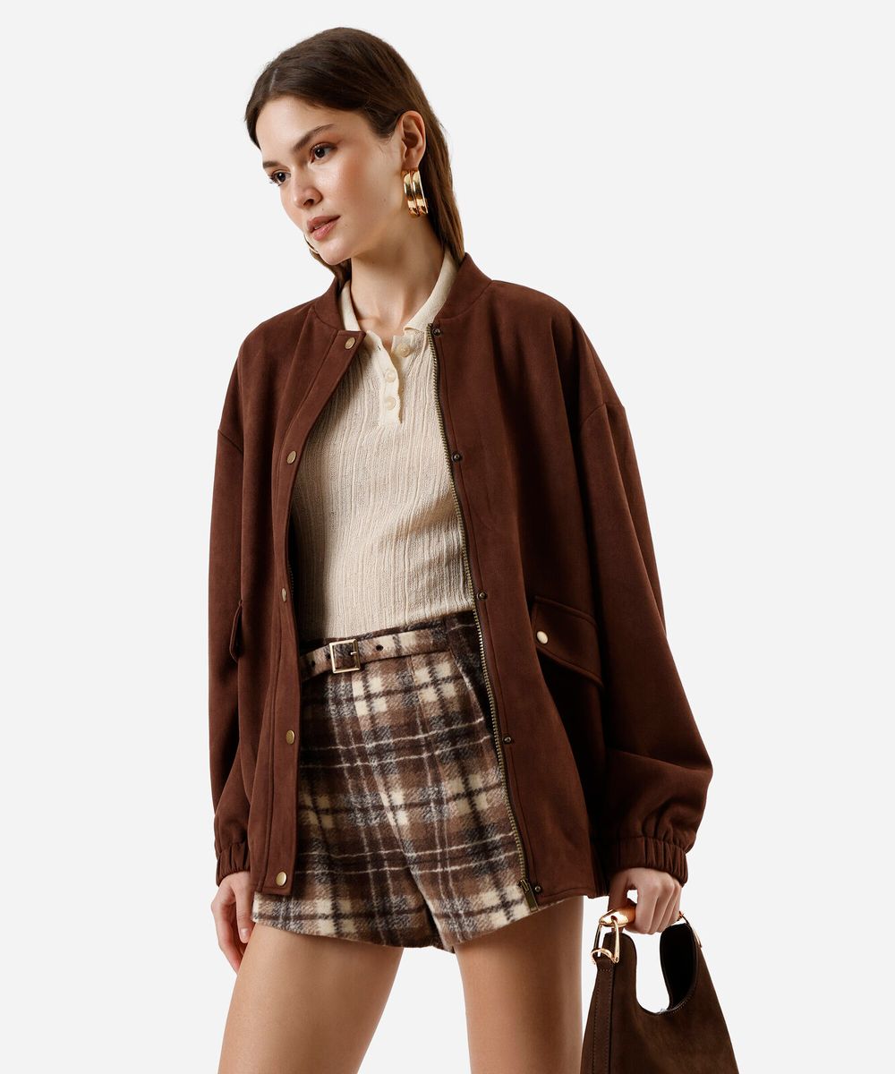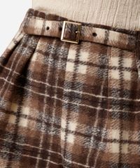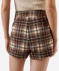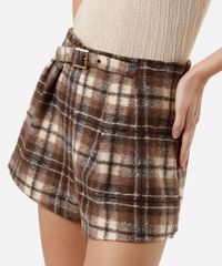 short feminino com cinto texturizado xadrez marrom