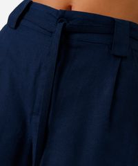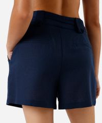 Short feminino confeccionado em tecido plano de viscose e linho. A peça tem modelagem reta e caimento solto ao corpo. O modelo tem cintura alta, cós com passantes para cinto, cordão para amarração, pregas frontais e fechamento por zíper e botão. Possui dois bolsos frontais e dois embutidos decorativos na parte posterior. Detalhe de acabamento pespontado nas barras.