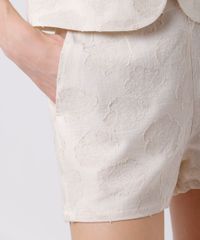 Short feminino confeccionado em tecido jacquard com padronagem floral. A peça tem modelagem reta e caimento levemente solto ao corpo. O modelo tem cintura alta, cós liso e fechamento lateral por zíper invisível. Possui dois bolsos frontais, forro em tecido plano e acabamento pespontado nas barras.