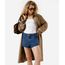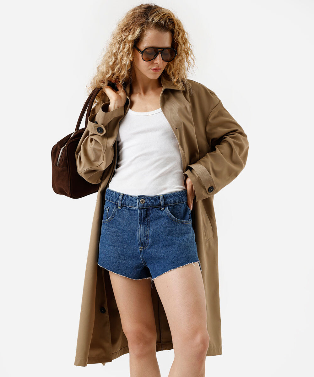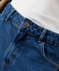Short feminino confeccionado em jeans estruturado. A peça tem modelagem reta e caimento solto ao corpo. O modelo tem cintura média, cós com passantes para cinto e fechamento por zíper e botão. Possui três bolsos frontais e dois aplicados na parte posterior. Detalhe de acabamento a fio nas barras, fendas laterais e pesponto contrastante.