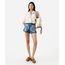 Short feminino confeccionado em sarja estruturada com bordado étnico na parte frontal. A peça tem modelagem reta e caimento ajustado ao corpo. O modelo tem cintura alta, cós liso e fechamento lateral por zíper. Possui dois bolsos frontais e acabamento pespontado nas barras.