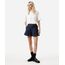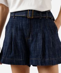 Short feminino confeccionado em jeans. A peça tem a modelagem reta, caimento solto ao corpo e barras amplas. O modelo tem cintura alta, cós com passantes, pregas frontais e fechamento por botão e zíper. Possui dois bolsos faca na parte frontal e dois aplicados na parte posterior. Detalhe de acabamento com pesponto contrastante. Acompanha cinto no mesmo material da peça.
