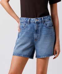 Short Los Angeles feminino confeccionado em jeans estruturado. A peça tem modelagem reta e caimento solto ao corpo. O modelo tem cintura alta, cós com passantes para cinto e fechamento por zíper e botão. Possui três bolsos frontais e dois aplicados na parte posterior. Detalhe de acabamento em pesponto contrastante.