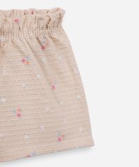 Short infantil confeccionada em malha texturizada de algodão com estampa floral. A peça tem modelagem reta e caimento solto ao corpo. O modelo tem cintura média, cós com elástico embutido e cordão decorativo. Detalhe de acabamento pespontado na barras.
