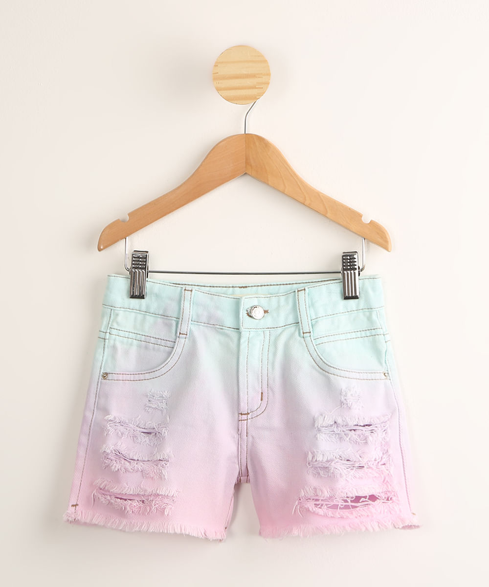 Short infantil feminino desenvolvido em sarja com degrade e acabamento destroyed. A peça tem modelagem reta, com caimento soltinho no corpo. Tem cós com passantes para cinto, dois bolsos na parte frontal e dois aplicados na parte posterior. Possui acabamento desfiado nas barras. O fechamento é por zíper e botão.