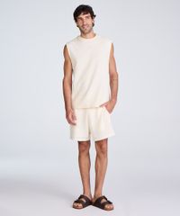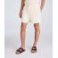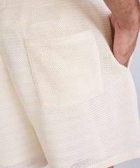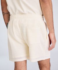 Bermuda masculina confeccionada em tecido texturizado de crochê com toque macio. A peça possui modelagem jogger com caimento reto e levemente solto, cintura média, cós com elástico embutido e cordão para ajuste, dois bolsos frontais estilo faca e um bolso posterior, detalhe de recortes e acabamento pespontado. Esta peça possui forro.