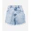 Short juvenil confeccionada em jeans de algodão. Possui modelagem reta, caimento levemente solto, cintura alta, cós com passantes aplicados, três bolsos frontais e dois bolsos posteriores, barra assimétrica desfiada, detalhes com puídos e fechamento frontal com botão e zíper embutido. Acabamento pespontado.
