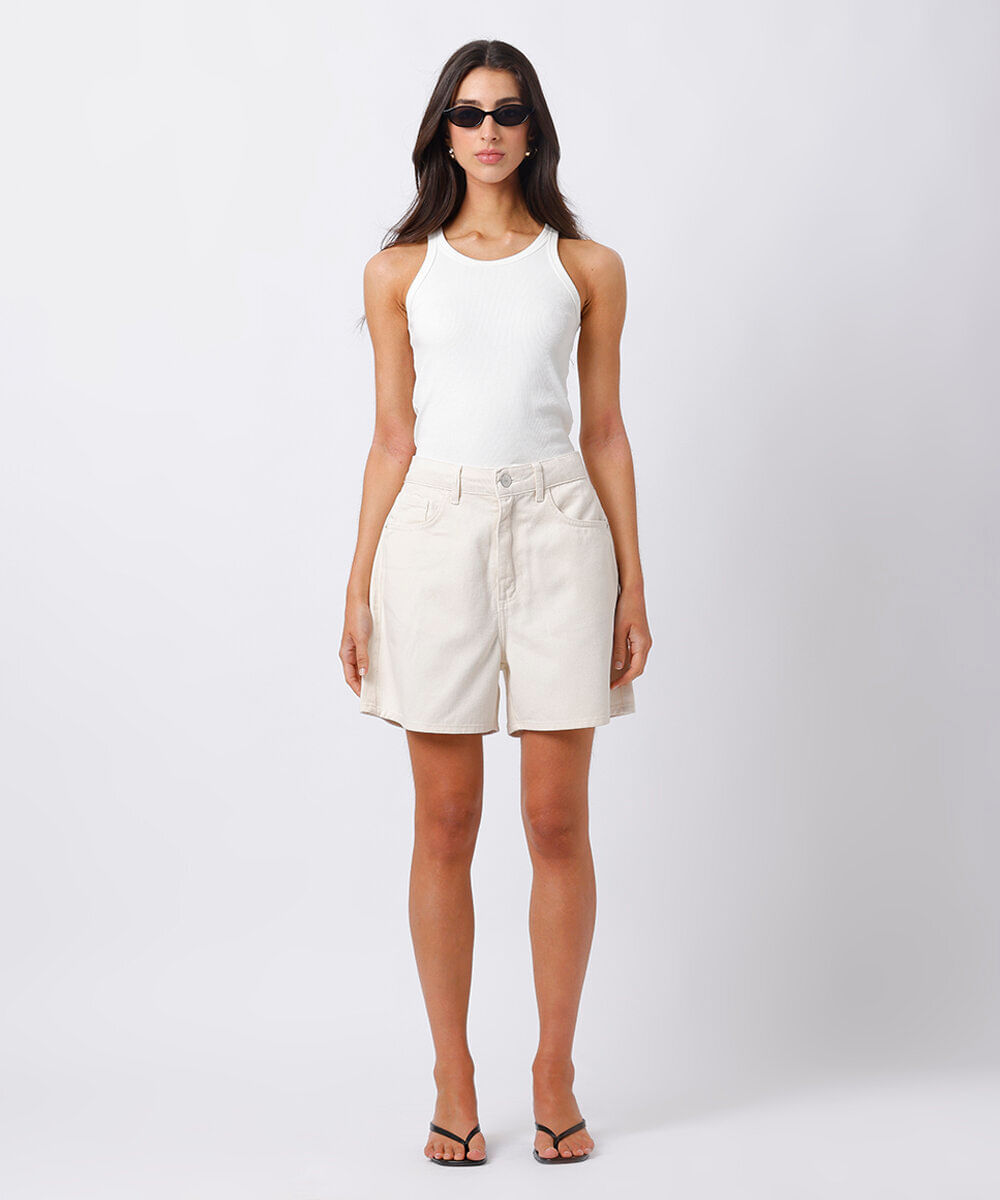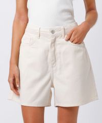 Short feminino confeccionado em sarja. O modelo Los Angeles tem construção reta, caimento solto ao corpo e barras levemente amplas. O modelo tem cintura alta, cós com passantes para cinto e fechamento por zíper e botão. Possui três bolsos frontais e dois aplicados na parte posterior. Detalhe de acabamento pespontado nas barras.