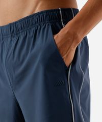 Short esportivo masculino confeccionada em tecido de poliamida com elasticidade. A peça tem modelagem reta, caimento solto ao corpo com recortes laterais com nervuras contrastantes. O modelo tem cintura média e cós com elástico embutido. Possui dois bolsos frontais e acabamento pespontado nas barras.