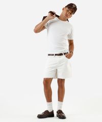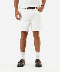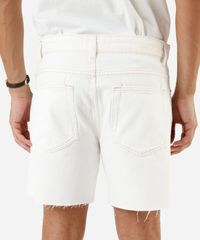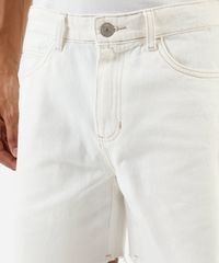 Short masculino confeccionado em sarja. A peça tem modelagem reta e caimento solto ao corpo. O modelo tem cintura média, cós com passantes para cinto e fechamento por zíper e botão. Possui três bolsos frontais e dois aplicados na parte posterior. Detalhe de acabamento em pesponto contrastante e barras a fio.