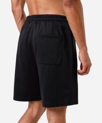Short masculino confeccionada em malha. A peça tem modelagem reta e caimento solto ao corpo. O modelo tem cintura média, cós com elástico embutido e cordão. Possui dois bolsos com zíper frontais, um aplicado na parte posterior e acabamento pespontado nas barras.