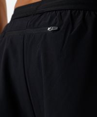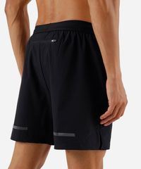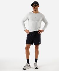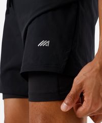 Short esportivo masculino confeccionado em tecido plano leve. A peça tem modelagem reta e caimento solto ao corpo. O modelo tem cintura média, cós elástico com cordão para ajuste e bermuda interna de compressão embutida. Possui dois bolsos frontais e um posterior com fechamento por zíper. Detalhe de acabamento com pesponto nas barras, refletivos e fendas discretas laterais.