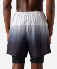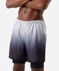 Short esportivo masculino confeccionado em tecido plano com estampa degradê. A peça tem modelagem reta e caimento solto ao corpo. O modelo tem cintura média, cós com elástico embutido, cordão para ajuste e bermuda interna embutida de leve compressão. Possui três bolsos e acabamento pespontado nas barras.