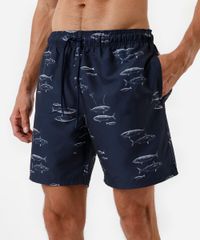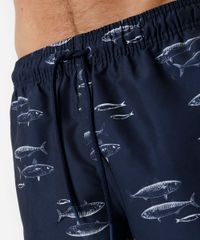 Short masculino confeccionado em tecido plano com estampa de peixes. A peça tem modelagem reta e caimento solto ao corpo. O modelo tem cintura média, cós com elástico embutido e cordão para ajuste. Possui dois bolsos frontais e um embutido na parte posterior. Detalhe de acabamento pespontado nas barras.