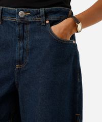 Short feminino confeccionado em jeans. A peça tem modelagem mom, com construção reta e caimento levemente solto ao corpo. O modelo tem cintura média, cós com passantes para cinto e fechamento por zíper e botão. Possui três bolsos frontais e dois bolsos aplicados na parte posterior. Detalhe de acabamento em pesponto contrastante.