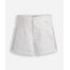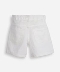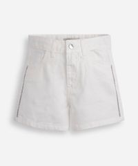 Short confeccionada em sarja. Possui modelagem mom, caimento levemente solto no quadril, cintura alta, cós com passantes aplicados, três bolsos frontais e dois bolsos posteriores, detalhes laterais com brilhos prateados aplicados, fechamento frontal com zíper e botão, acabamento pespontado.