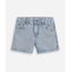 Short infantil confeccionada em jeans estruturado. A peça tem modelagem mom, com construção reta e caimento solto ao corpo. O modelo tem cintura média, cós com passantes para cinto e fechamento por zíper e botão. Possui três bolsos frontais e dois aplicados na parte posterior. Detalhe de acabamento com brilhos aplicados nas laterais.