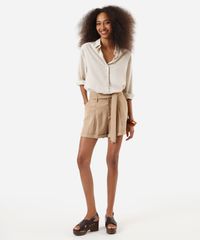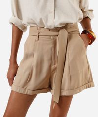 Short feminino confeccionado em tecido plano com viscose. A peça tem a modelagem e construção reta e o caimento é solto ao corpo. O modelo tem cintura alta, cós com passantes para cinto, pregas e fechamento frontal por botão e zíper. Possui dois bolsos na parte frontal e acabamento com dobradura fixa nas barras. Acompanha faixa para amarração.
