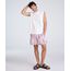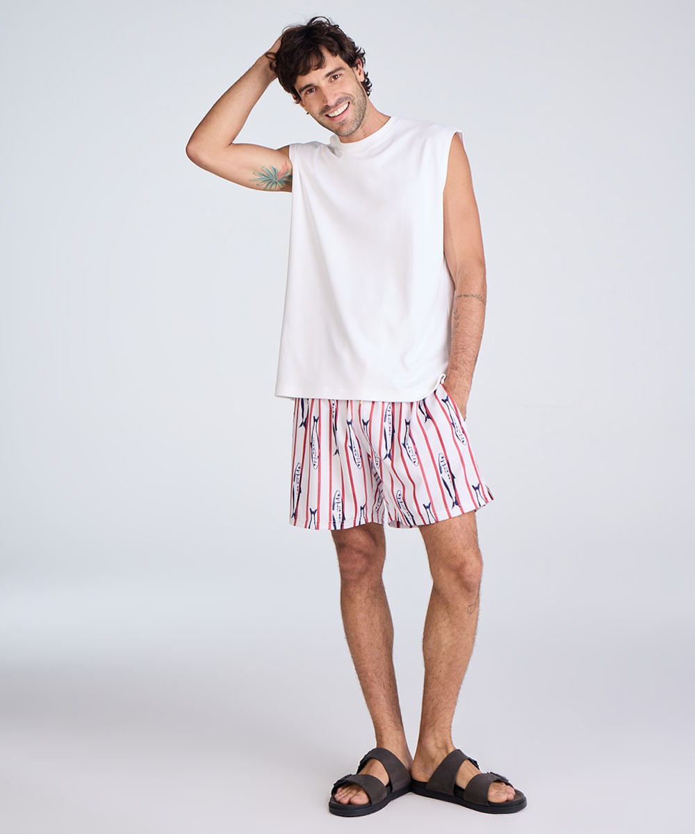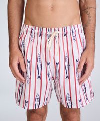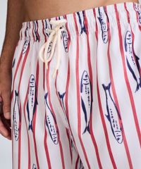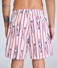 Short masculino confeccionado em tecido com toque leve. A peça possui modelagem reta com caimento levemente solto, cintura média, cós com elástico embutido e cordão para ajuste, dois bolsos frontais estilo faca e um bolso posterior com fechamento por velcro, estampa com desenhos de sardinhas e padronagem listrada em cores contrastantes, acabamento pespontado.