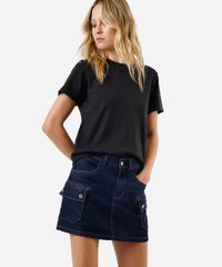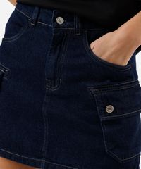 Short saia cargo feminino confeccionado em jeans. A peça tem modelagem cargo, com construção reta e caimento levemente ajustado ao corpo. O modelo tem cintura alta, cós com passantes para cinto e fechamento por zíper e botão. Possui dois bolsos frontais, dois utilitários nas laterais e acabamento em pesponto contrastante.