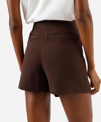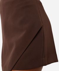 Short saia de alfaiataria feminino confeccionado em tecido plano com viscose. A peça tem modelagem reta, caimento levemente ajustado ao corpo com sobreposição assimétrica na parte frontal. O modelo tem cintura alta, cós liso e fechamento por zíper invisível. Possui dois bolsos decorativos e acabamento pesponto invisível.