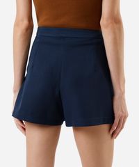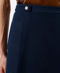 Short saia feminino confeccionado em tecido com toque macio. A peça tem modelagem reta, comprimento curto e caimento ajustado ao corpo. Possui cintura alta, cós decorado com botões na cor dourada, saia sobreposta, fechamento lateral com zíper invisível e acabamento pespontado.