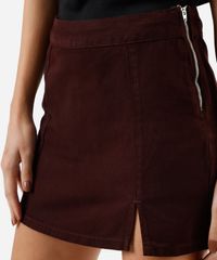 Short saia feminino confeccionada em sarja. A peça tem modelagem reta com caimento levemente ajustado ao corpo. O modelo tem cintura alta, cós liso e fechamento é por zíper. Detalhe de acabamento pespontado na barra e fenda.