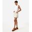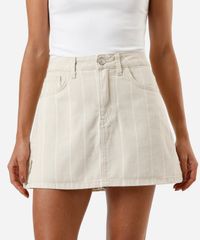 Short saia feminino confeccionado em sarja com padronagem listrada. A peça tem modelagem reta e caimento levemente ajustado ao corpo. O modelo tem cintura alta, cós com passantes para cinto e fechamento por zíper e botão. Possui três bolsos frontais e dois posteriores. Detalhe de acabamento com pesponto nas barras e fendas laterais.