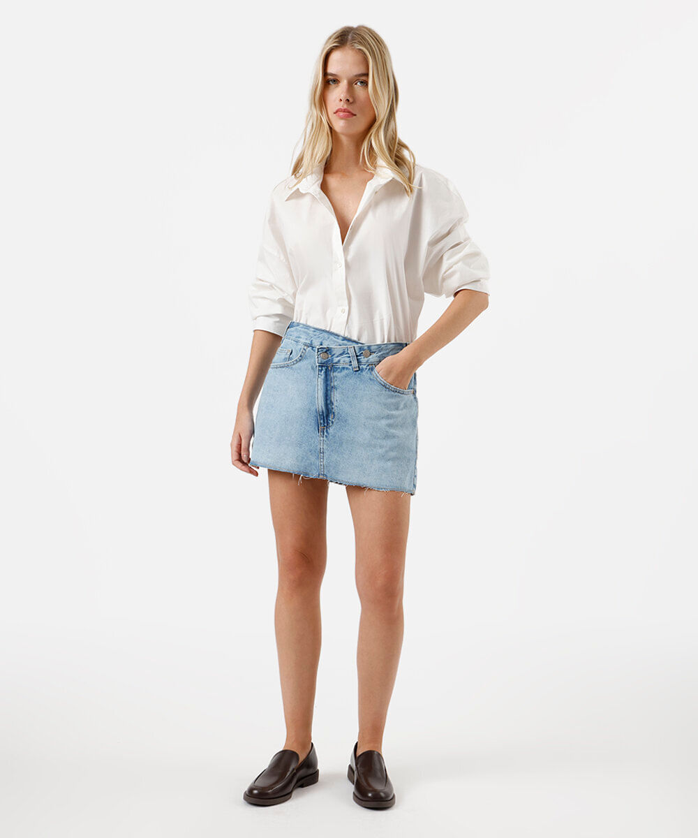 Short saia feminino confeccionada em jeans estruturada. A peça tem modelagem reta e caimento levemente solto ao corpo. O modelo tem cintura média, cós deslocado com passantes para cinto e fechamento por zíper e botão. Possui três bolsos frontais e dois aplicados na parte posterior. Detalhe de acabamento a fio na barra.