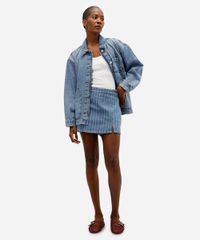 Este short saia jeans é a peça que une o melhor de dois mundos: a feminilidade da saia com a praticidade e o conforto de um short. Confeccionado em jeans de algodão, oferece um toque macio e um caimento estruturado para o dia a dia. A padronagem listrada vertical adiciona um toque moderno e despojado, tornando este shorts jeans feminino um item versátil para compor looks cheios de estilo.