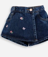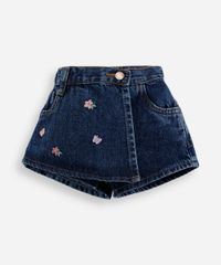 Short saia infantil confeccionada em jeans com lavagem escura com estampa bordada de flores. A peça possui modelagem reta, cintura alta, cós com elástico embutido, bolsos frontais e posteriores, acabamento pespontado e fechamento frontal por zíper e botão. Composição: 100% algodão Instruções de lavagem: - Lavar à temperatura máxima de 40ºC - Proibido o alvejamento - Não secar em tambor - Secagem em varal à sombra - Passar à temperatura média - Limpeza à úmido, processo normal
