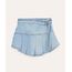Short saia confeccionado em jeans leve. Modelo com pregas e cinto com fivela de transpasse, cós com elástico e barra pespontada.