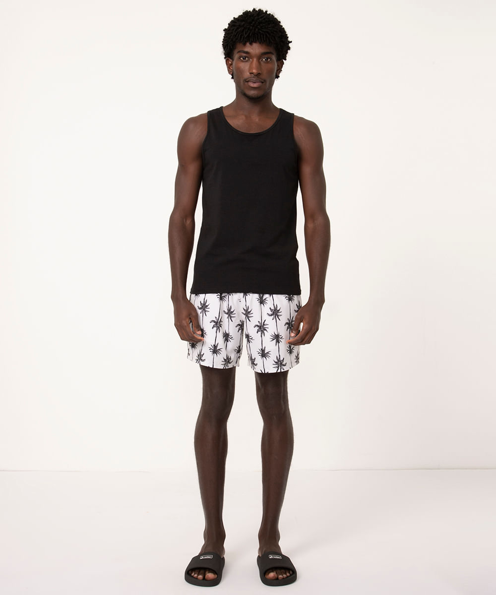 Short confeccionado em tecido plano leve com estampa de coqueiros em cor contrastante. A peça possui cós elástico com cordão embutido ajustável, dois bolsos frontais, um posterior com fechamento por aba e velcro. Caimento reto, forro em tela, comprimento curto e acabamento pespontado.