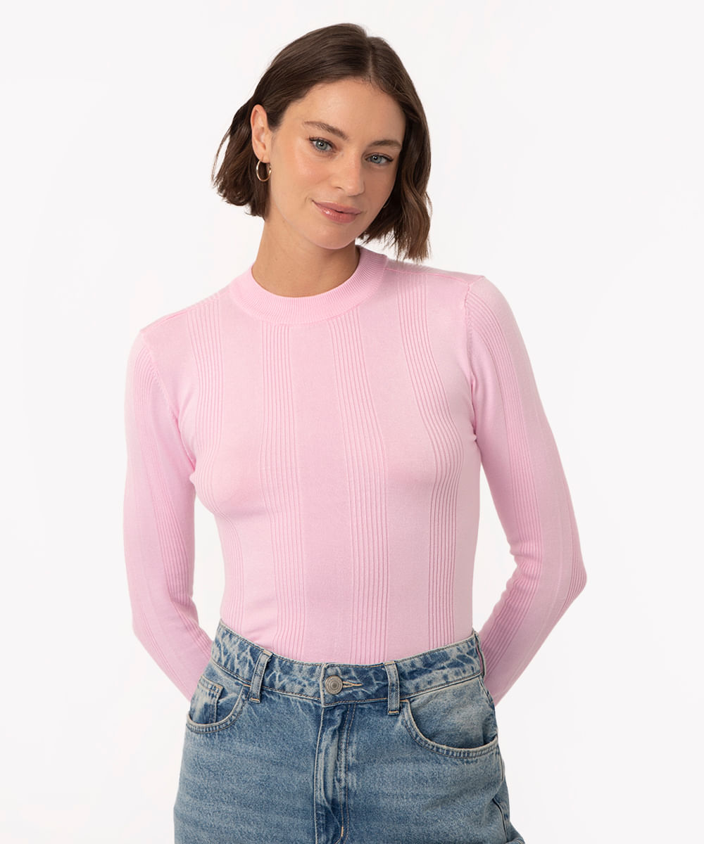 Este suéter feminino é uma peça-chave para um guarda-roupa versátil e cheio de estilo. Confeccionado em um tricô macio, seu design canelado se ajusta delicadamente ao corpo, proporcionando conforto e um visual elegante. Perfeito para os dias mais amenos, este modelo é a base ideal para diversas composições, transitando facilmente entre o casual e o sofisticado.