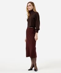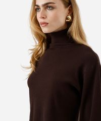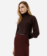 Suéter feminino confeccionada em tricot com textura canelada. A peça tem a modelagem e construção reta, caimento solto ao corpo e comprimento cropped. O modelo tem gola alta e mangas longas bufantes.